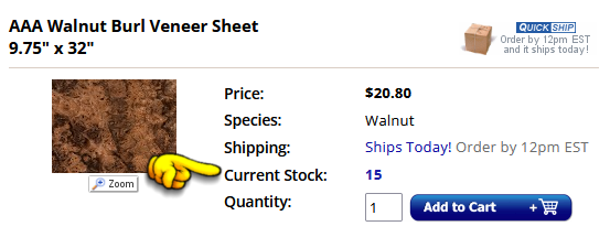 The website will display our real time inventory level on the product page and on the category listing page. Use this to your advantage by planning ahead! Keep in mind that some veneers sell very fast and others do not. If you need 10 sheets to finish a project and there are 12 left, it might be a good idea to buy all 12 so you have extra just in case something you miscalculated your project requirements. Otherwise, the remaining 2 sheets may be sold before you have time to re-order.